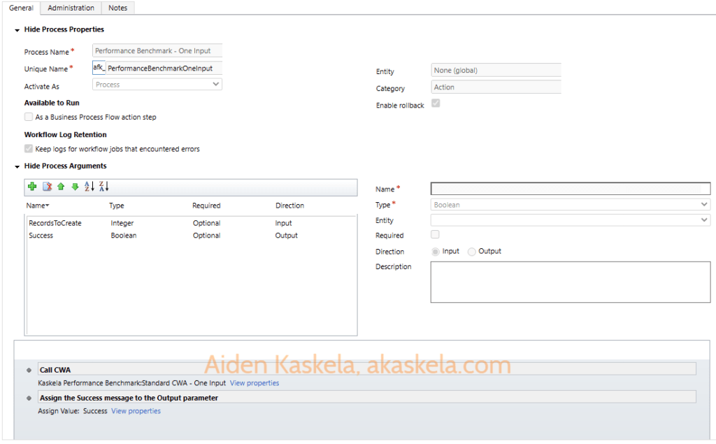 To compare those values, I created three CWAs that mirror those plugins (Baseline, Baseline + 10, Baseline + 25), and invoke those CWA from three Custom Actions. These Actions have additional steps to assign the input and output parameters, and if there is a performance difference this is where we’d expect to see it.