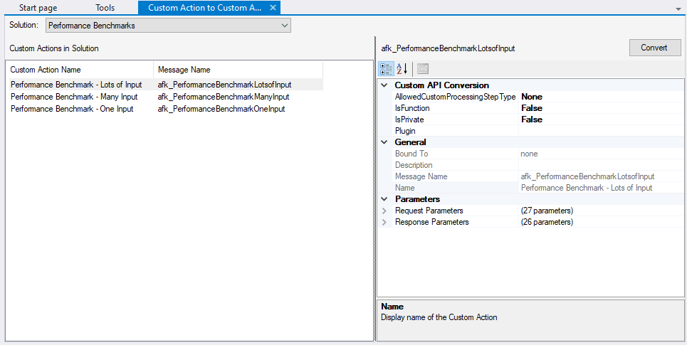 Fortunately, Business Applications MVP Mark Carrington developed a tool for the XrmToolBox (links below) that will help convert your Custom Processes to Custom APIs. This tool will create the API records you need based on the current Action and all you’ll need to do is associate it with your newly updated plugin. Major warning with this tool though – it will delete your existing Action and replace it with a new one with the same name. That makes it a seamless change as far as anything which calls the method, but deleting anything carries the possibility of data loss or rollout complications.