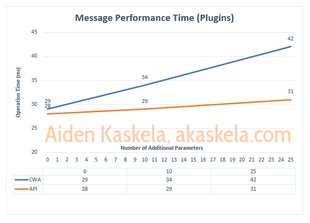 However, as we ramp up the number of parameters we can see a disparity grow between the CWA and Plugin. When we get to 25 parameters, the CWA calls take 35% longer than the comparable Custom API calls. The scaffolding around setting the parameters in the CWA has a significant impact on the overall time of the operation.